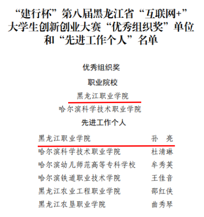 “建行杯”第八届黑龙江省“互联网+”大学生创新创业大赛“优秀组织奖”单位和“先进工作个人”名单