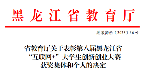 近日,永利官网收到省教育厅印发的《关于表彰第八届黑龙江省“互联网+”大学生创新创业大赛获奖集体和个人的决定》(黑教高函[2023]66号)。
