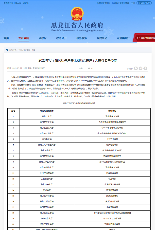 2023年9月11 日,黑龙江省厅为深入贯彻落实党的二十大精神和习近平总书记关于教育的重要论述特别是关于教师队伍建设的重要指示批示精神,大力弘扬我省教育系统广大教师立德树人、无私奉献的精神,为全省各级学校和广大教师树立学习的榜样,组织开展了2023年度全省师德先进集体和师德先进个人评选活动,智能制造技术学院荣获2023年度全省师德先进集体荣誉称号。