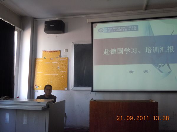 机械分院院长柳河教授首先做了题为“赴德国学习、培训汇报”的专题汇报,柳河院长介绍了德国概况,特别是德国的职业教育概况,阐述了德国的职业教育标准及实施方法,提出了我院进行骨干院校建设可以借鉴学习的方面。