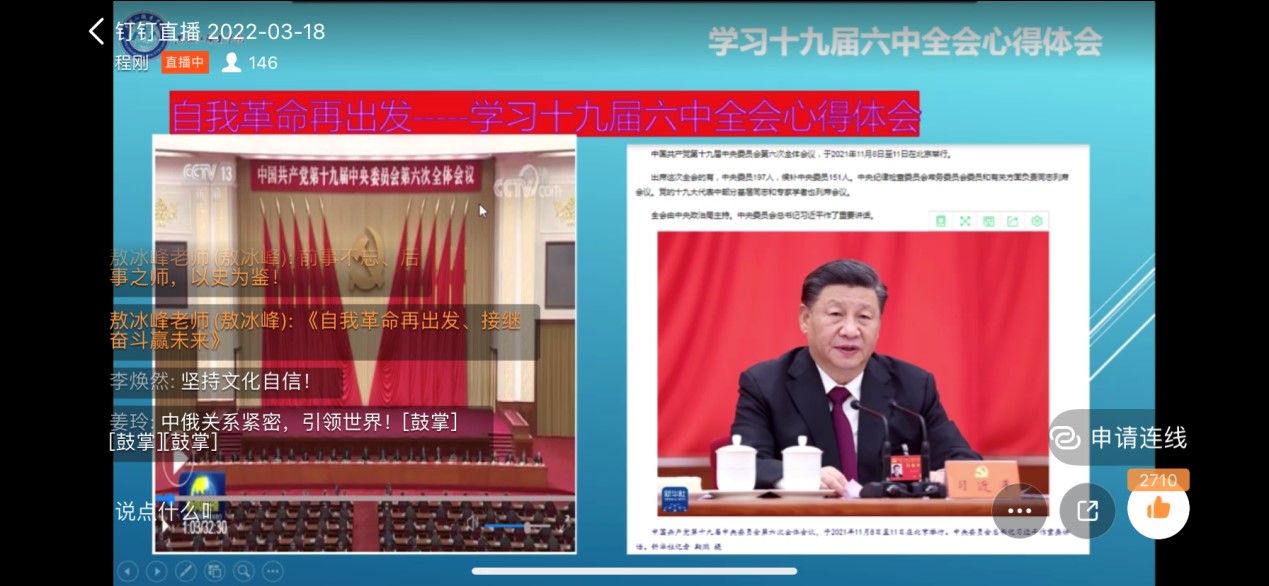 为进一步学习宣传贯彻党的十九届六中全会精神,把思想和行动统一到全会精神上来,按照学校统一部署和要求,3月18日下午,智能制造技术学院线上召开以“自我革命再出发,培育青年赢未来”为主题的学习贯彻党的十九届六中全会精神专题宣讲会。马克思主义学院党总支书记程刚同志作专题宣讲。分院全体教职工、学生预备党员及全体学生会干部参会并认真学习了党的十九届六中全会精神。