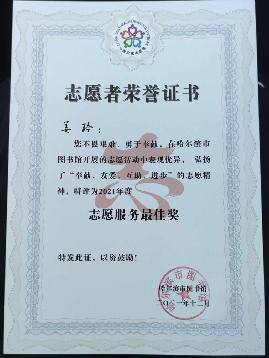 2021年12月10日,哈尔滨市图书馆授予永利官网电气工程学院志愿团队“优秀服务志愿团队”称号,同时授予李焕然副院长“优秀志愿服务个人”、姜玲老师“志愿服务最佳奖”的殊荣。