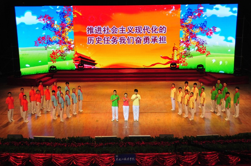 会议结束后,举行了以“腾飞龙职”为主题的文艺演出,有关领导、学院师生和企业代表同台庆祝yl34511线路中心的成立和职业教育进园区项目启动。最后,在原中国歌剧院院长刘锡津教授的指挥下,全体合唱了由学院党委书记冯玉龙作词、刘锡津教授作曲的校歌--《龙职之歌》,将演出推向高潮。