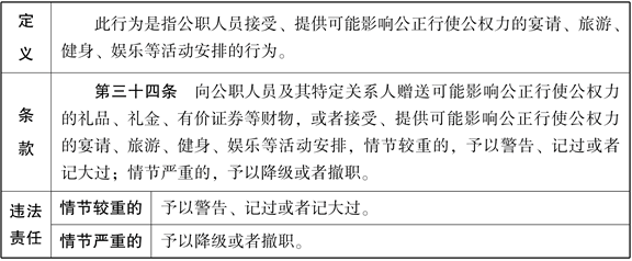 该行为主要包括两种情形:一是接受可能影响公正行使公权力的宴请、旅游、健身、娱乐等活动安排。所谓的“可能影响公正行使公权力”,是指对公职人员公正执行公务有可能带来潜在的影响。所谓的“可能”,主要是立足于防范,只要具有影响公正执行公务的可能性,就必须禁止,而不是已经产生了影响公正行使公权力的后果才去处理。二是提供可能影响公正行使公权力的宴请、旅游、健身、娱乐等活动安排。行为的主体是公职人员。所谓的“提供”,一般是指为宴请或者旅游、健身、娱乐等活动安排地方、场所、车辆、给付金钱等。