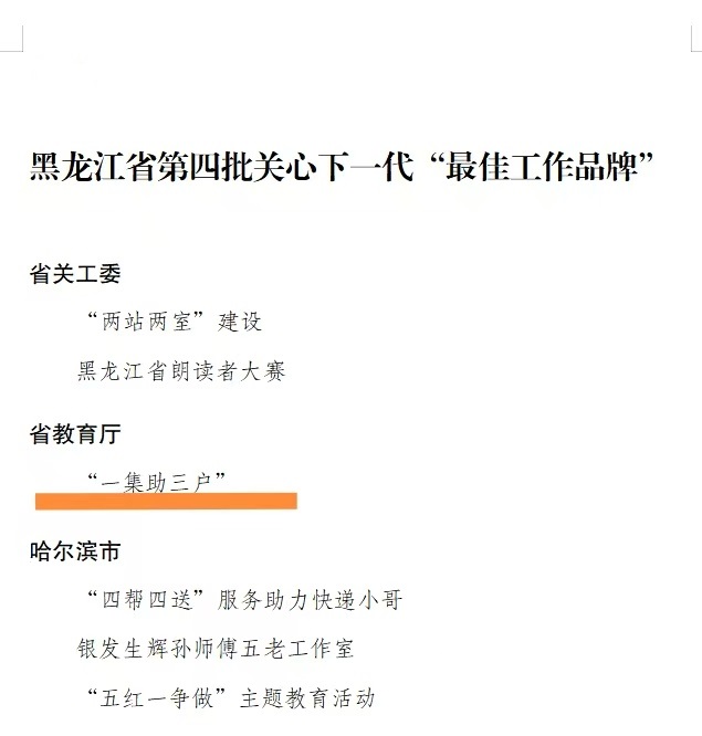 近日,黑龙江省第四批关心下一代“最佳工作品牌”评选结果公布,由省教育厅关心下一代工作委员会(以下简称“关工委”)唯一推送的,以永利官网关工委“一集助三户”为典型案例的关工品牌,被黑龙江省关工委评为“最佳工作品牌”。