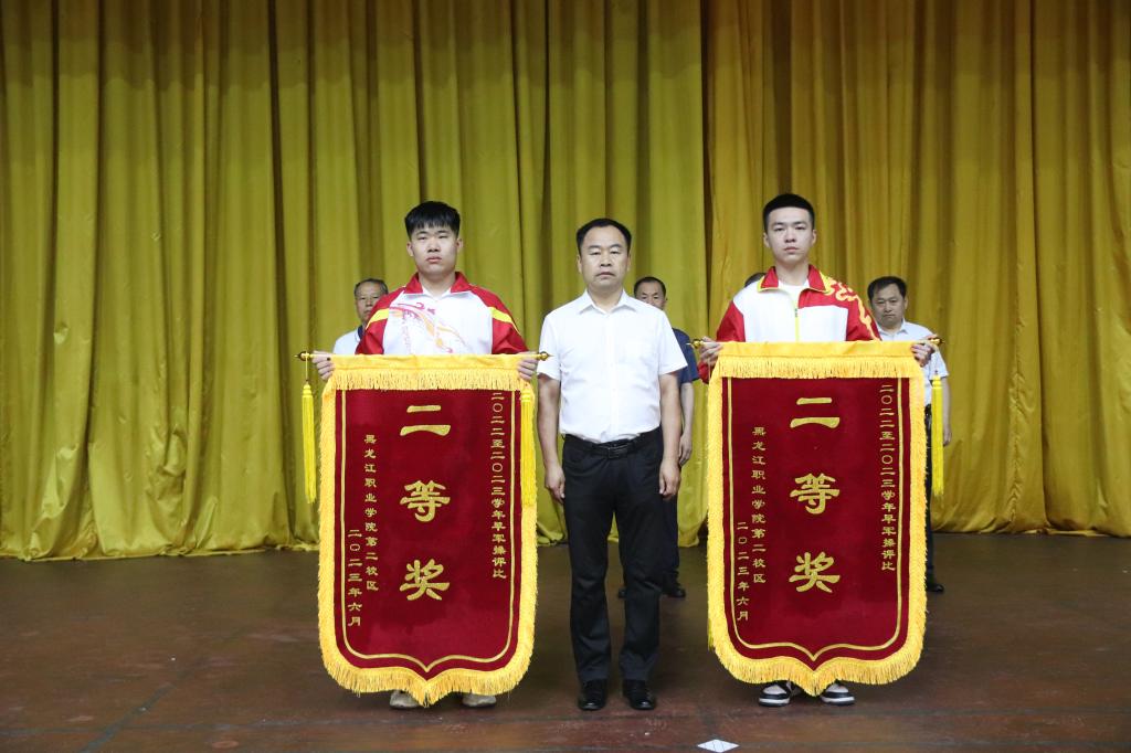 会上,赵彦生宣读了第二校区2022-2023学年学生早军操表彰奖励决定,钟敏强、赵彦生、第二校区各二级学院党总支书记分别为获得表彰的先进集体颁发奖旗。