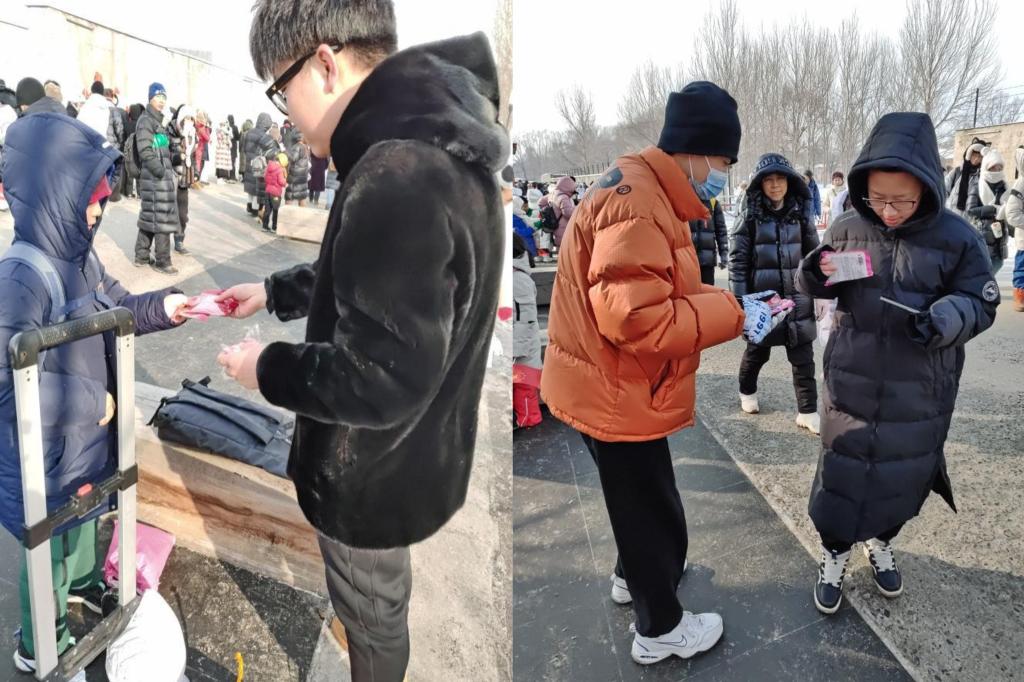 得知每天排队参观的游客特别多,程刚购买了3000余贴保暖贴,带领青年马克思主义社团吕汶卓等6名同学,为游客免费发放。长长的队伍绵延数公里,游客却异常安静,在接到免费发放的保暖贴时,有游客问:“你是党员吗?”当得到肯定的回答时,他们竖起大拇指点赞。吕汶卓说:“天虽冷,参观的游客却很多,作为新时代的大学生,我愿意尽一份力,让游客感受到哈尔滨人的热情与温度。”