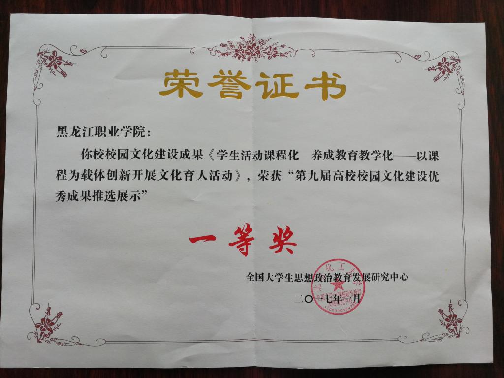 全国高校校园文化建设优秀成果评选工作由教育部组织实施,是我国高校校园文化建设成果的最高奖项。一等奖是黑龙江省高校参加历届全国评选获得的最高荣誉,永利官网是全省唯一获此殊荣高职院校,也是本届评选中全省本专科院校唯一 一等奖获奖单位。