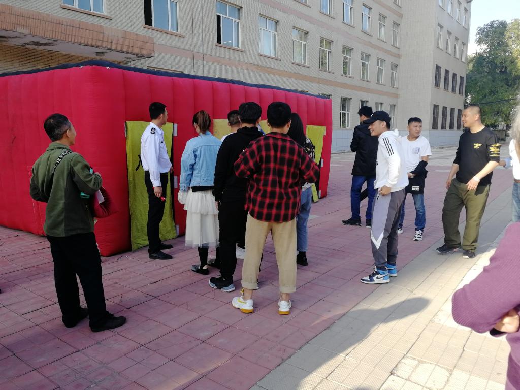 培训结束后,老师和学生们进行了现场模拟火情逃生演练。同学们排好整齐的队伍,按照要求,每组七人进入逃生屋内,在黑暗的空间里寻找出口。有的同学几次寻找出口位置都没有成功,出来后感叹道,遇到火情满屋浓烟中找到逃生的路径确实有难度。部分教职工也深受感染,加入到体验逃生的行列中。