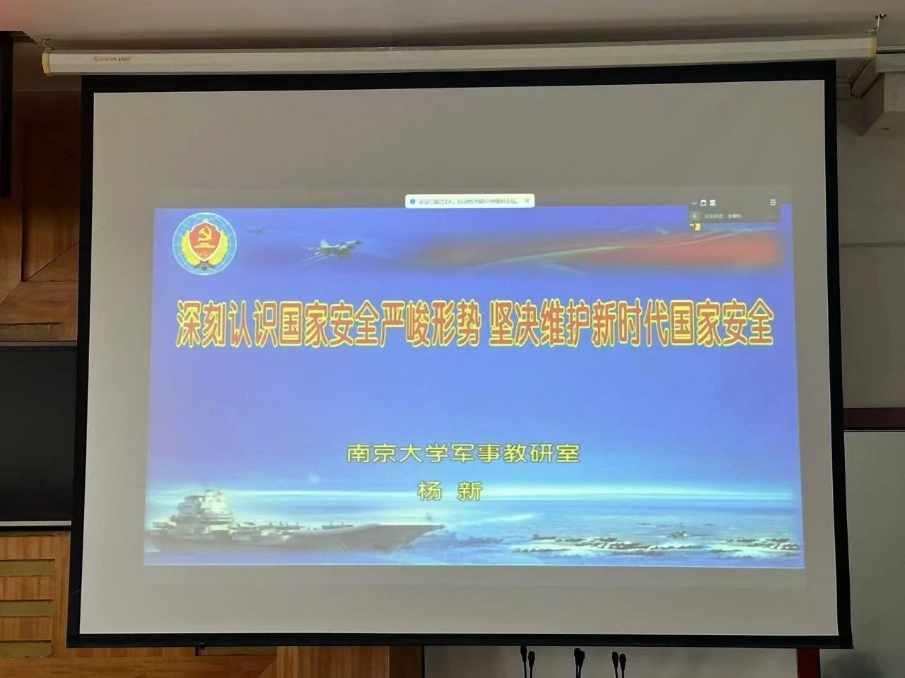 杨新教授以线上连线的方式与现场师生互动交流,他结合实际工作分享了国家安全教育的宝贵经验和有效做法,引导同学们深刻理解国家安全面临的复杂挑战与机遇,全方位阐述总体国家安全观的丰富内涵,引导同学们在日常生活中不断增强国家安全意识和法治素养。姜立峰老师对国家安全的重要意义进行了深刻阐释,他详细分析了当前国家安全所面临的挑战,并且明确指出大学生维护国家安全的具体路径,通过一个个生动的案例和一组组详实的数据,使在场学生真切地感受到国家安全与每个人息息相关,深刻认识到维护国家安全是每个公民的神圣职责。