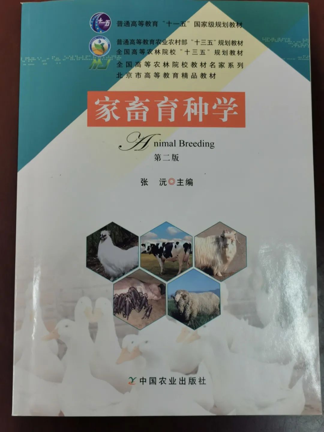(1)在育人大纲及教材选用上,既注重课程内容的全面、系统、深入及前沿性,又注重将思政元素与育人目标进行有机结合。本课程育人大纲以动物育种学特有的“定量性、精密性和预见性”为抓手,以《家畜育种学》(张沅,第二版,2018,下图)为主要参考教材,把生产性能测定、个体遗传评定、种畜选择选配、品种培育及杂种优势利用、种质资源保护利用等内容作为授课主线,自始至终体现育种核心公式“表型=遗传+环境”,即P=G+E在动物种业理论、畜禽群体遗传改良科学原理、主要育种技术方法中的重要性;同时,积极引导学生在学习《动物育种学》过程中,充分理解和有效利用动物育种重要知识理论,认识稳定强大的国家大环境对人才培养及个人发展的重要性,体会自身努力和先天遗传在成长成才过程中的辩证关系等。