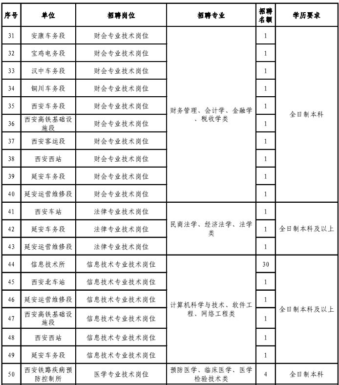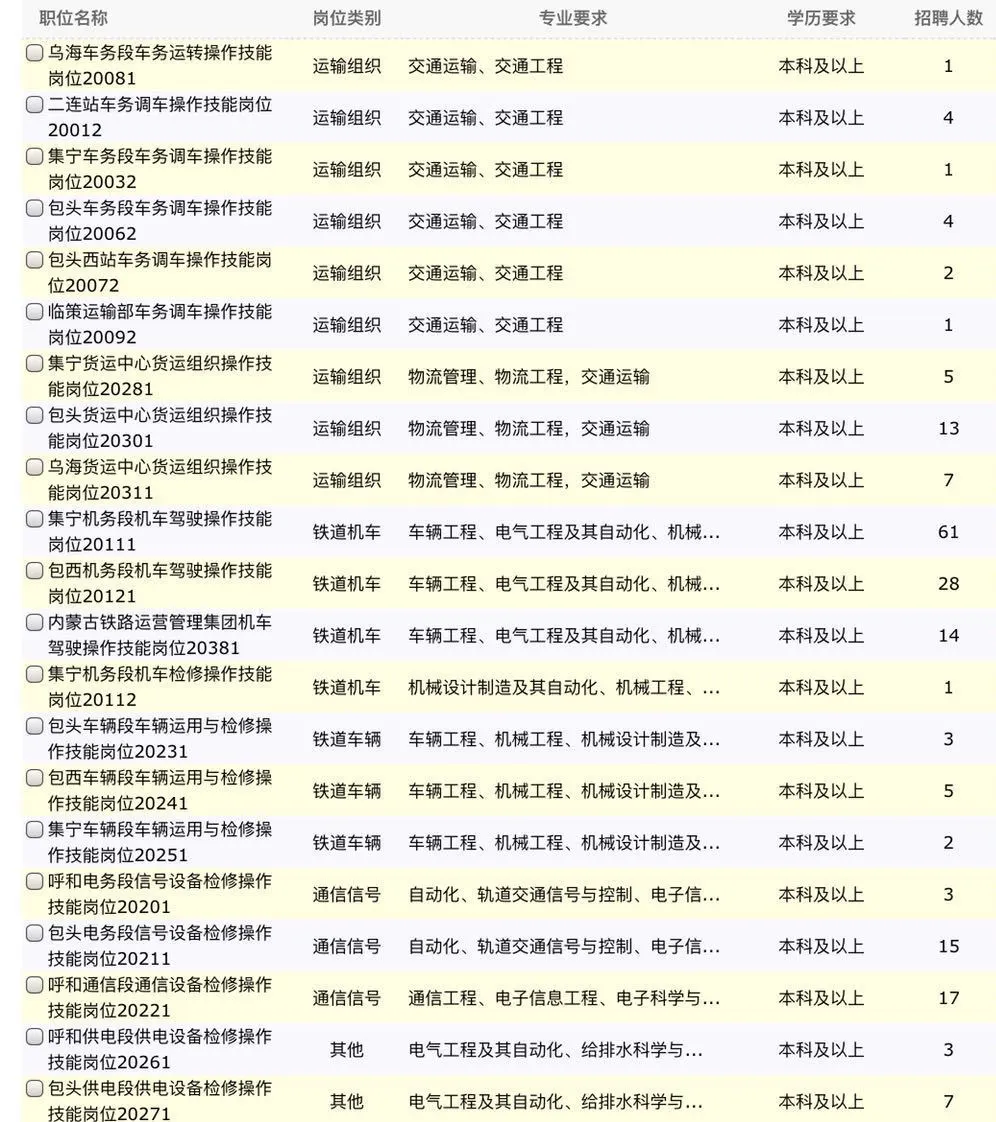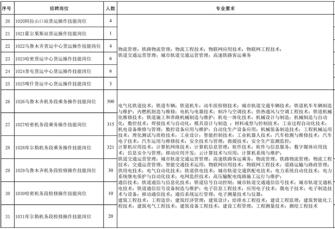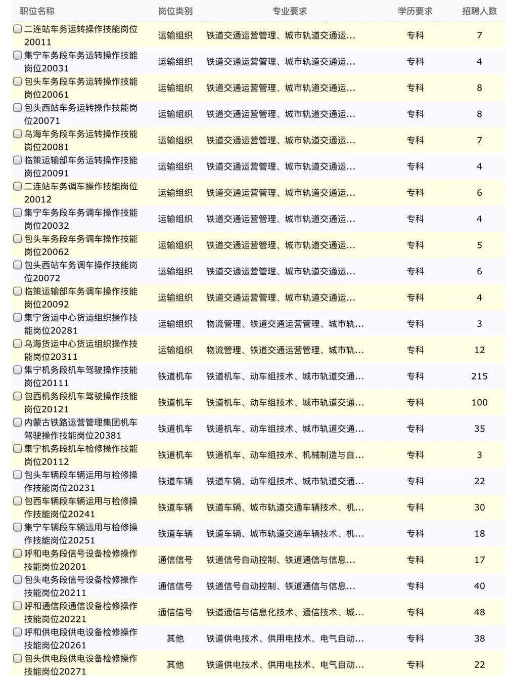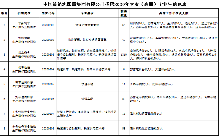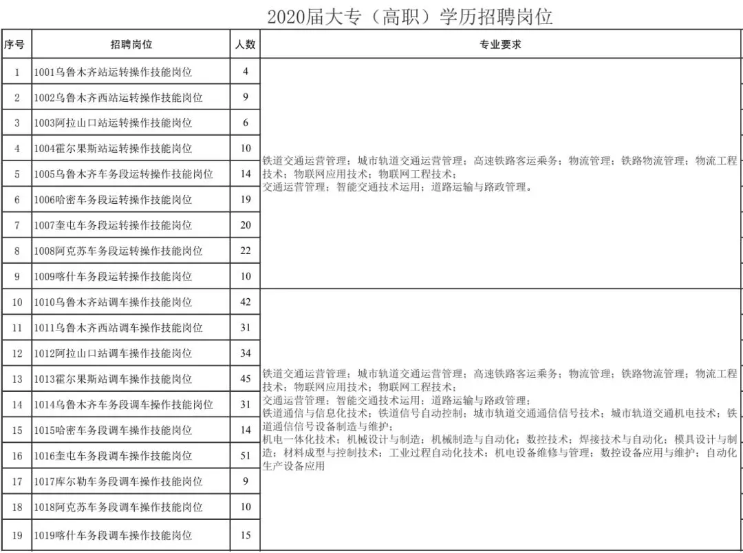 2.符合招聘岗位要求的专业条件,列入国家招生计划、具备派遣资格,2020年和2019年毕业的全日制普通高等院校大专(高职)学历毕业生。除岗位代码为20023、20026、20028、20034外,其余招聘岗位必须在校期间所学专业为铁路方向或所学主要课程中包含铁路专业课程。