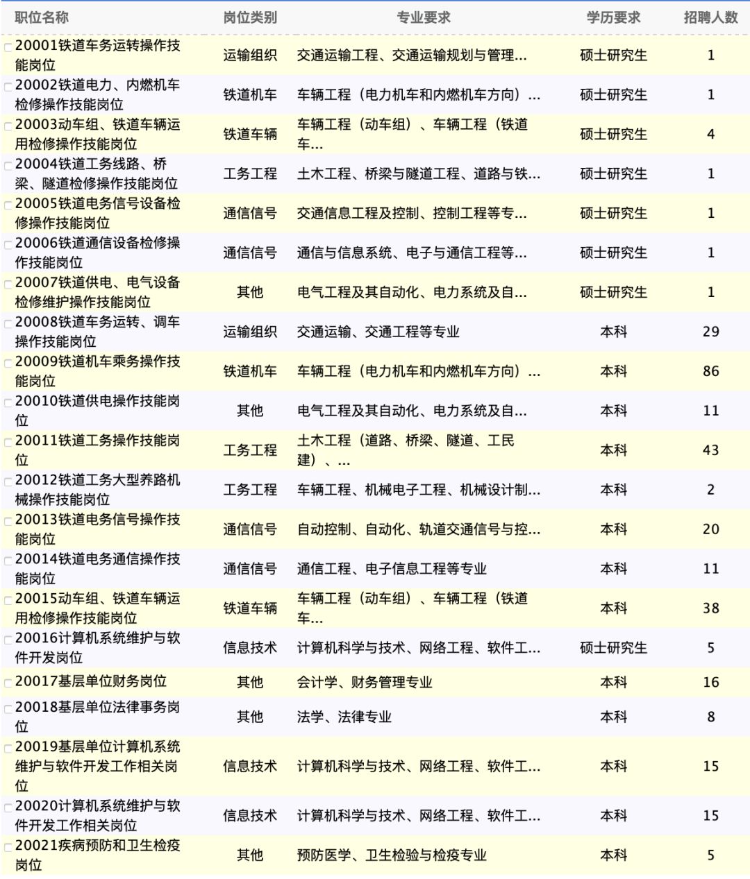 (1)岗位代码20001-20015:要求铁路主专业毕业生在校期间所学专业方向为铁路专业方向或所学主要课程中包含铁路专业课程,相近专业为高质量院校毕业生;
