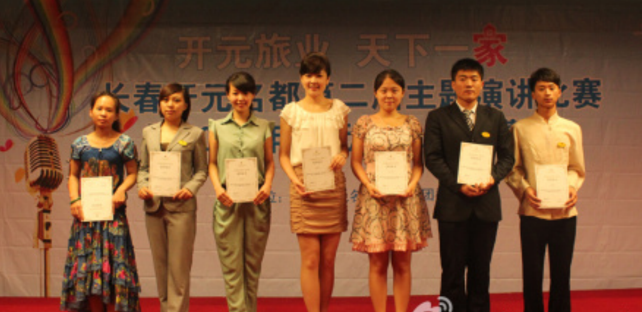 我院师生融入开元酒店集团企业文化 我院实习学生在开元文化节与开元集团领导合影 开元文化节我院学生担任英语主持人 酒店前台员工外语能力大赛我院专业英语教学团队杨威老师担任评委 我院学生牛耀凯等在开元酒店集团举办的主持人大赛中获奖