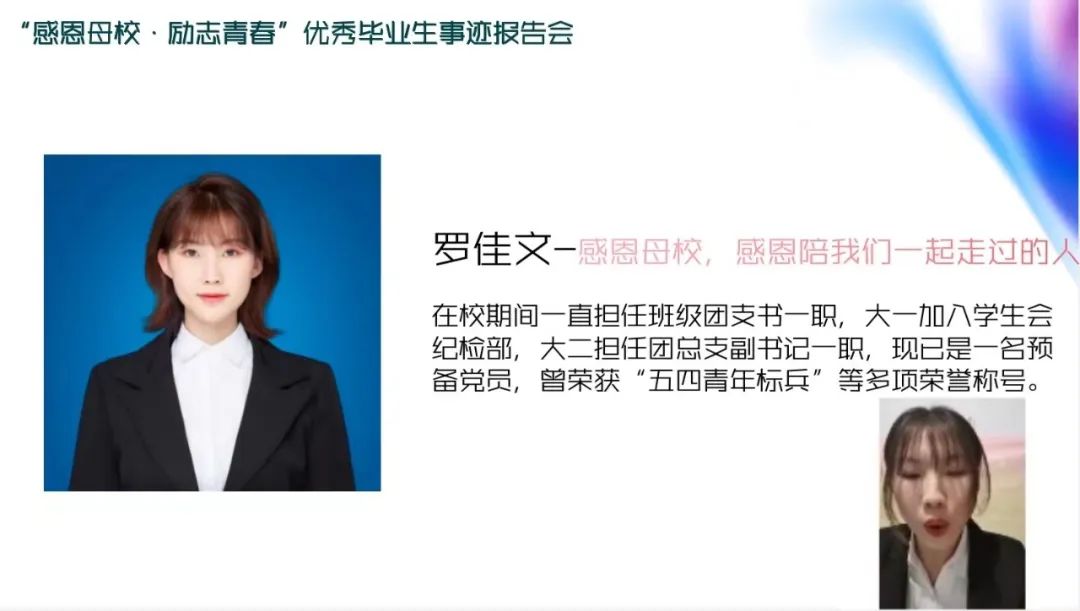 罗佳文说学校给大家提供了非常好的施展才华的舞台,大家要充分展现自我。她分享了自己在学校期间丰富多彩的经历和取得的荣誉,她是班级团支书、团总支副书记,加入了学校社团,疫情期间成为抗疫志愿者。她激励学弟学妹们要努力学习、不断创先争优,把荣誉化为动力,提升专业修养和实践能力。要珍惜大学时光,认真上好每一堂课,提升思想觉悟,锻炼交际能力,养成良好的生活习惯,为未来工作打下坚实基础。