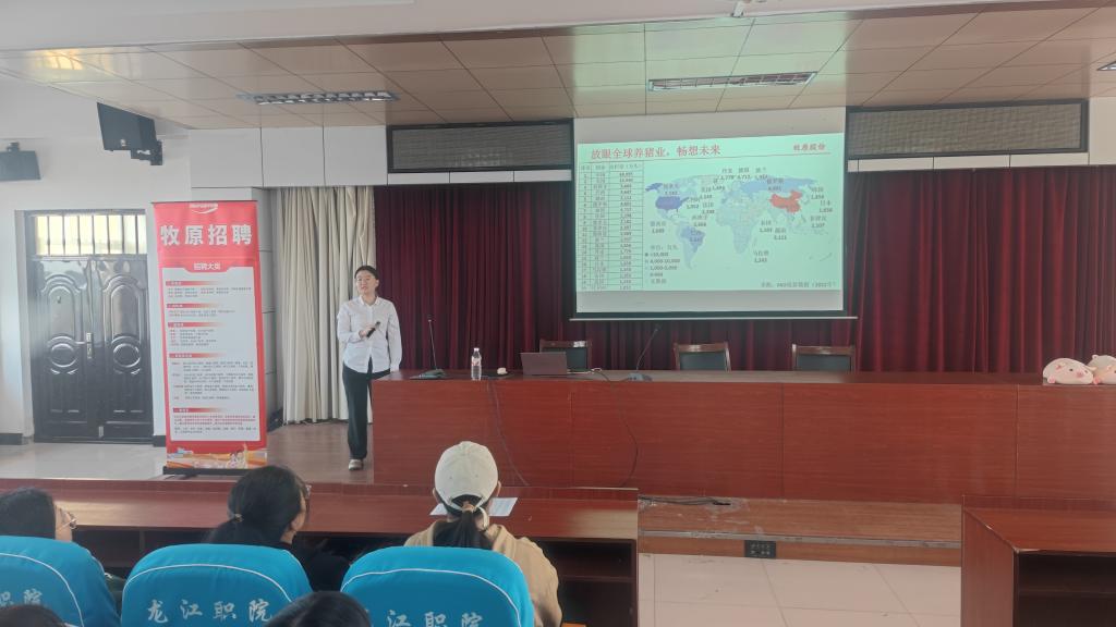 在宣讲会上,牧原集团区域人资负责人郭若楠向同学们介绍了牧原集团的发展历程、产品及产业链、路径规划、招聘计划及福利待遇等内容。