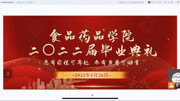 2022年5月26日19时,食品药品学院2022届毕业典礼在腾讯会议平台顺利举行。由于疫情的缘故,本次毕业典礼在云端举办,虽然无法像往常那样相聚龙职共话离别,但希望线上毕业典礼可以弥补食品药品学院毕业生心中的一丝遗憾,为我院2022届毕业生的大学生活画上一个圆满的句号。
