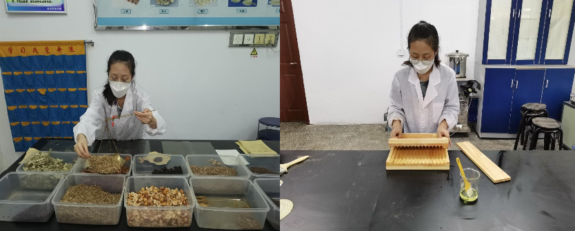 师生5月20日返校后便立刻进入备战状态,从空荡荡的实训楼中不断传来飘出炮制中药的味道和粉碎中药的嗡嗡声。面对中药传统技能大赛项目多、内容复杂且2022年新增中药制剂赛项,指导教师董术发和参赛选手李菊每天起早贪黑,一起研究比赛内容,从赛项规程入手,把握比赛细节,严格按照比赛要求进行训练,力争做到不放过任何一个得分点。备赛训练过程是辛苦的、时间是漫长的,在这期间我院领导多次到实训室关心师生的训练情况,给予大力支持和鼓励。综合办不辞辛劳,及时按照需求采购训练材料,保证了训练的正常进行。