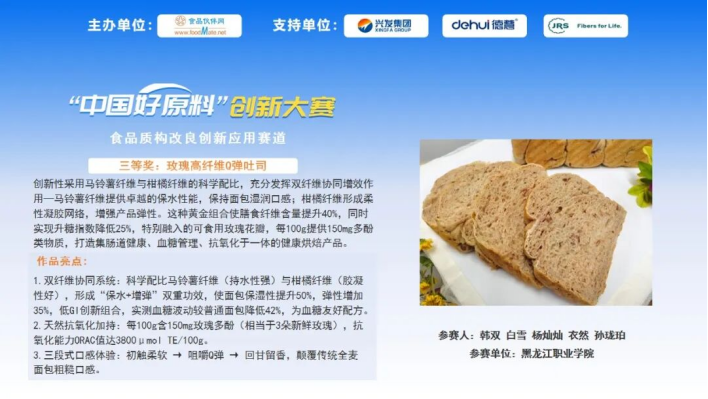 历经2个多月的激烈角逐与专业评审,备受行业瞩目的“中国好原料” 创新大赛-食品质构改良创新应用赛道落下帷幕。本赛道自启动以来,受到食品企业、院校单位的从业人员的积极响应。我院由教师韩双、白雪,学生杨灿灿、衣然、孙珑珀组成参赛队伍,经过线上路演评审、线下品鉴评审两个环节,选派的参赛作品“玫瑰高纤维Q弹吐司”最终从入围决赛的46份作品中脱颖而出,荣获三等奖。