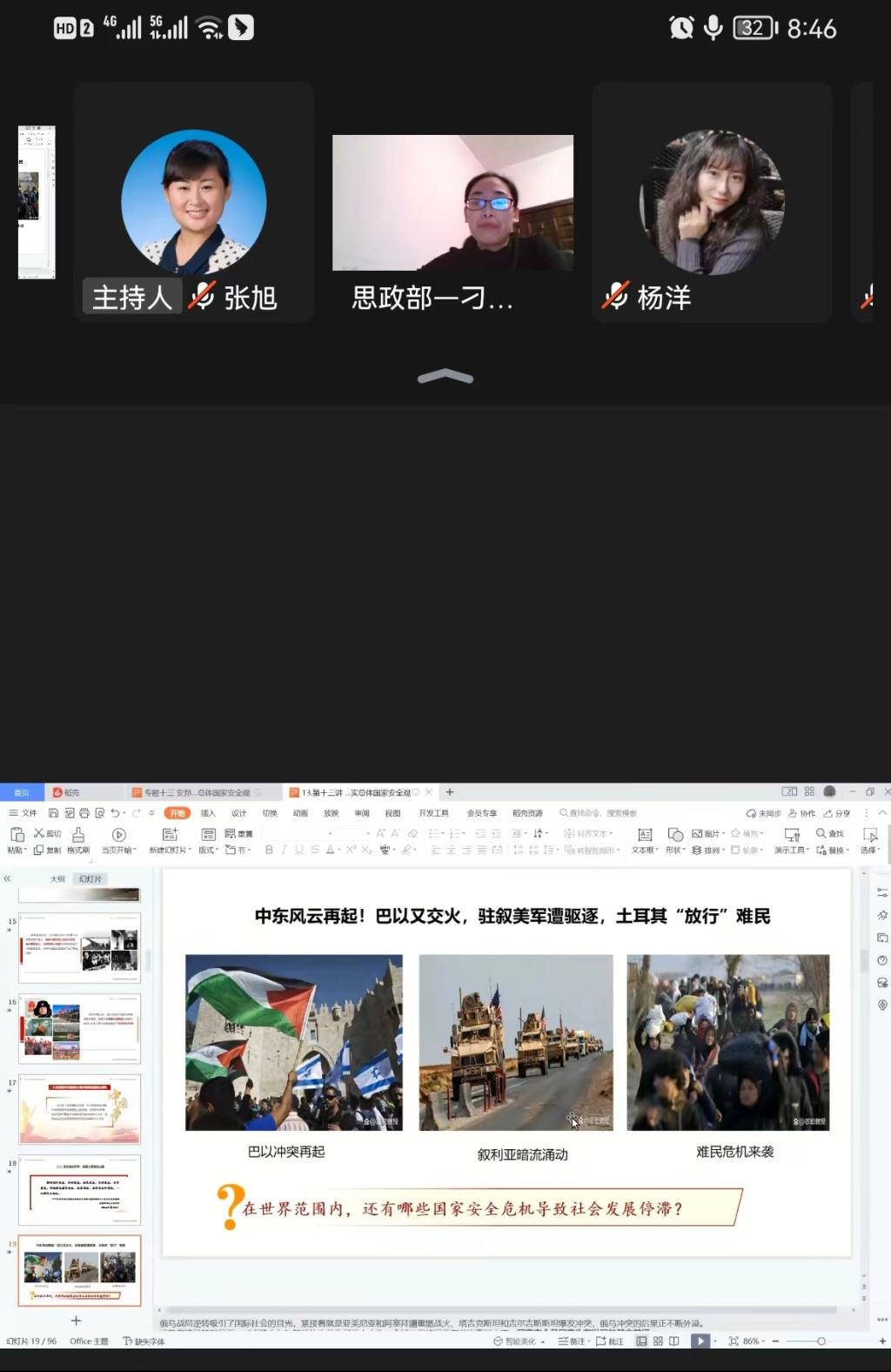 刁宁宁老师主备《专题十二:全面贯彻落实总体国家安全观》主要从为什么说保证国家安全是头等大事;什么是总体国家安全观和怎样着力防范化解重大风险三个方面进行了阐述。结合学生学情,提出影响国家安全的社会热点问题,能够引发学生的共鸣。在教学设计中能够很好的把四史中关于国家安全的相关内容融入教学中,科学严谨地将理论阐析寓于历史叙事中,增进大学生对习近平新时代中国特色社会主义思想中总体国家安全观的的深刻理解。
