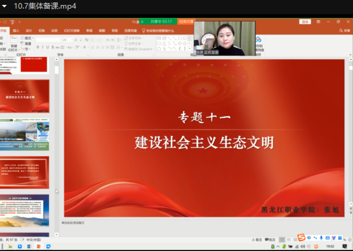 张旭老师主备《专题十一:建设社会主义生态文明》贴合学生实际,明确了知识、能力、素质三级目标以及教学重难点。运用了最新案例和视频,深刻回答了为什么建设生态文明、建设什么样的生态文明、怎样建设生态文明等重大理论和实践问题。教学方式多样,切合学生认知基础,注重素质目标的考核与评量,切实增强学生获得感。