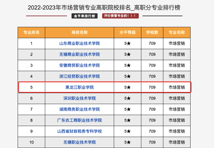 在2022年3月,金平果连续第十一次推出中国高职院校竞争力排行榜,本次高职评价范围以教育部最新公布的《2021年全国高等学校名单》为依据,结合学校的实际招生情况,确定高职院校评价对象为1516所,其中高职高专1484所、职业本科32所。从学校、地区、类型、专业大类、专业类、专业和专业群等多维度科学量化结果。yl34511线路中心市场营销专业在2022-2023年高职院校专业排名中位居全国第五位。