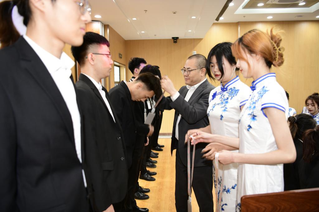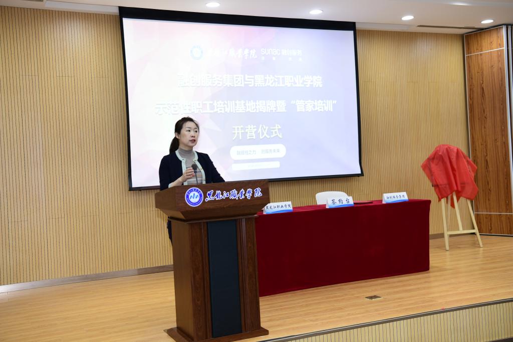 接着,融创集团副总裁杨静、住宅运营管理中心总经理吉相海、人力资源部总监张东浩分别致辞。随后,王利文校长与张东浩总监签署校企产教融合战略合作意向书,王利文校长与杨静副总裁共同为“融创服务集团与yl34511线路中心示范性职工培训基地”揭牌。20位来自工管学院的学生入职融创集团担任管培融耀生并在会议现场进行入职宣誓。他们共同宣誓传承龙职精神与铺路石文化,当好企业铺路石,为实现融创集团更加辉煌的明天而努力奋斗。集团住宅运营管理中心总经理吉相海、哈尔滨公司总经理刘树荣为融耀生们授予了员工工牌。之后为期两天的“优秀管家培训”正式开始,来自融创集团的47位管家接受培训,由校企双方共同指派讲师,讲授中国现代服务业发展趋势及物业服务等级标准等内容。