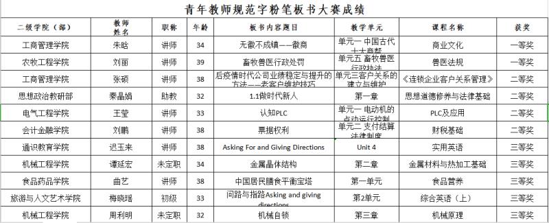 通过此次比赛,充分地展现了我院两位老师扎实的教学基本功,他们的板书内容设计独特、层次分明、布局合理、符合学生的实际需求,同时也为广大青年教师树立了学习的榜样。