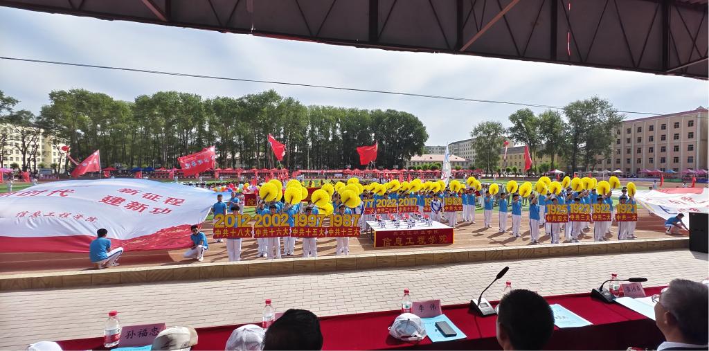 6月9日早上8时运动会正式拉开帷幕。体育场内红旗飘扬、英姿飒爽,信息工程学院方队高举院旗、高呼院训,同来自各学院代表队一起怀着坚定的信念,迈着整齐的步伐走进会场。检阅队伍表演开始后,同学们个个衣着整齐,面带笑容,为大会献上了异彩纷呈的团体演出。其中,我院学生朝气蓬勃、表现优异,刀旗队、方队的表演受到学校领导的一致好评,舞蹈队的表演为接下来的运动竞技拉开了精彩的序幕。