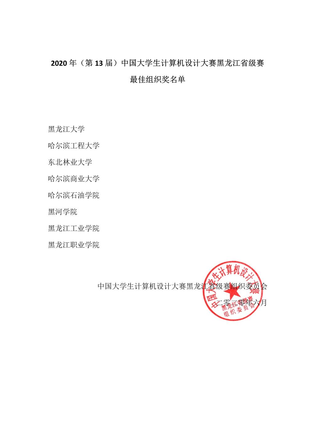2020年6月9日,在哈尔滨商业大学举行的第十三届中国大学生计算机设计大赛黑龙江省赛高职高专组成绩揭晓,信息工程学院四支参赛队伍共获得省赛一等奖1项、二等奖1项和三等奖2项,永利官网荣获高职院校唯一“最佳组织奖单位”,来自哈尔滨工程大学、黑龙江大学、东北林业大学等众多省内高校百余支队伍参加本次竞赛。