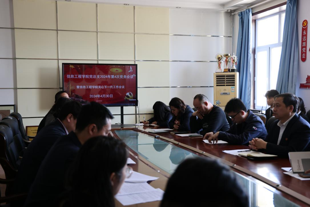 2024年4月30日中午12:30,信息工程学院党务会议暨关心下一代工作会议在信息工程学院党员活动室召开。学院总支全体成员出席,学管办主任、教研室主任、全体辅导员、优秀青年教师代表、学生会主席以及团总支副书记等列席。会议由学院党总支书记金忠伟主持。