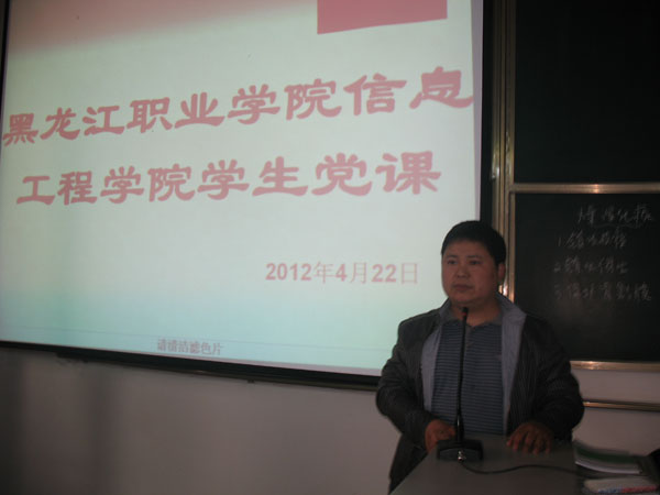 4月23日晚5:00,信息工程学院曹立志老师在新实训楼110为学生入党积极分子讲授本学期第二次党课,参加讲座的同学认为曹老师的党课耳目一新,纷纷感慨听到了一堂洗涤心灵的生动党课。