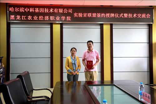 随后,我院教学副院长姜桂娟与哈尔滨中科基因技术有限公司总经理张建军签署了“哈尔滨中科基因实验室联盟协议”;张建军总经理向动物科技分院院长冯永谦颁授了“中科基因实验室联盟成员单位”牌匾;姜桂娟副院长为中国农业科学院哈尔滨兽医研究所研究员、博士生导师田志军颁发了我院“客座教授”聘书。