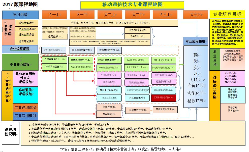 核心课程:Java SE编程技术、Android应用开发技术、移动通信技术、宽带接入技术、APP UI设计技术、光纤通信工程、通信业务开发、通信工程勘测设计与概预算、路由型与交换型互联网技术、4G-LTE基站建设、通信工程监理实务、通信线务工程与施工、程控交换技术、基站系统运行与维护、移动通信接入网运行与维护、网络安全技术、移动终端测试与维护等。