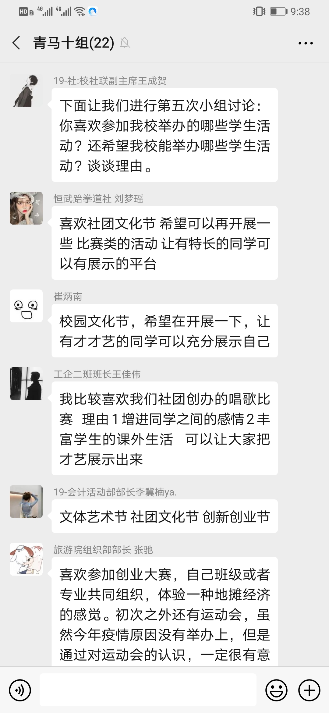 在小组讨论环节,同学们就“你喜欢参加永利官网举办的哪些学生活动?还希望永利官网能举办哪些学生活动?”展开了充分的讨论,同学们纷纷发言,并解释,学生活动可以锻炼自己、展现自己,也可以建立与人沟通的能力和交往能力,还可以锻炼大家的团队协助能力。