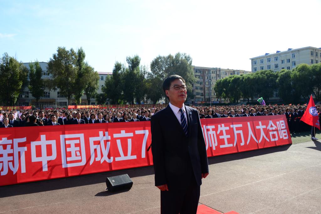 当日,学校党委书记赵继会宣布大合唱开始,副校长郑福贵主持。学校运动场上,鸣放礼炮,奏唱国歌,五星红旗迎风飘扬,师生手举国旗,共同唱响了《我和我的祖国》《歌唱祖国》《龙职之歌》。之后,大家高喊“不忘初心,牢记使命”“自强有为,兴业报国”,并传递国旗,放飞气球。师生们歌声嘹亮,激情万丈,饱含对祖国的爱,对远大理想的追求,敞开胸怀,纵情高歌,唱出英雄气概,唱出心中豪迈,展现了党员领导干部勇当先锋、做好表率的积极风貌,展现了学校师生员工热爱祖国的家国情怀,以及为黑龙江建设发展奉献青春热血的信心与担当。
