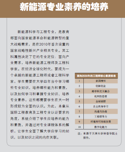 针对上述问题,学校根据课程思政建设的要求,面向大一新生组织实施了“专业导论课程和教材建设计划”。首批共立项建设了十门专业导论课程。下面以《新能源专业导论》课程和教材建设为例加以介绍。